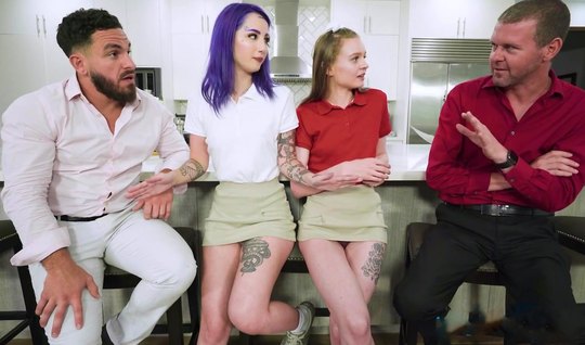 The tattooed gangsters called two young friends for a group sex at their villa. Having undressed the girls, the lovers immediately gave them both large sticks by the cheeks and caught pleasure. The beauties are ready to rub the studs' erect bumps not only with their mouths, but also with slits wet from vaginal juice.